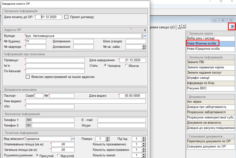 Абонентський відділ → особові рахунки (обираємо необхідну нам адресу) → натиснути кнопку "додаткові функції"→ обрати "Нова фізична особа"→ відкриється вікно "заведення нового ОР":