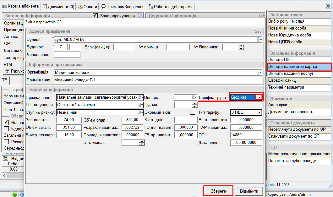 - у полі "Тарифна група" змінити на тарифну групу з потрібним розрахунковим рахунком (що заведено у довіднику розрах. рахунків юридичних осіб) - і натиснути "Зберегти":