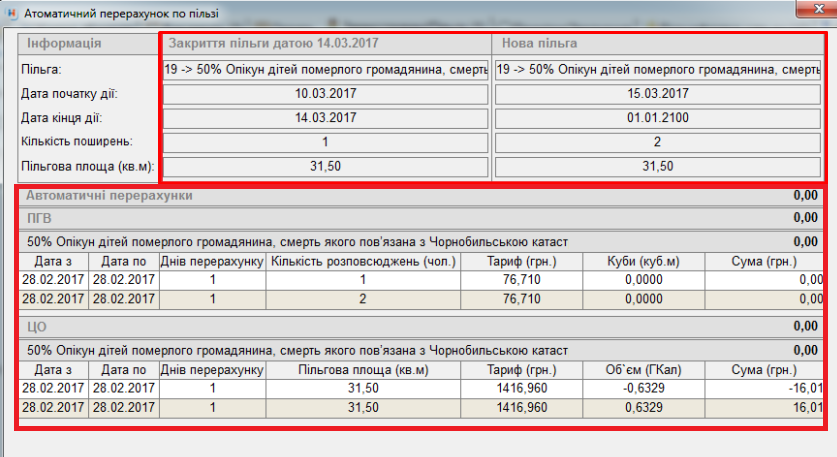 при зміні дати початку/кінця дії пільги, у вікні "Автоматичний перерахунок по пільзі" буде відображено: з якої дати і на яку дату початку/кінця була зміна: