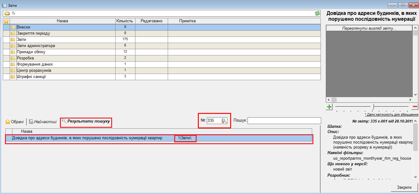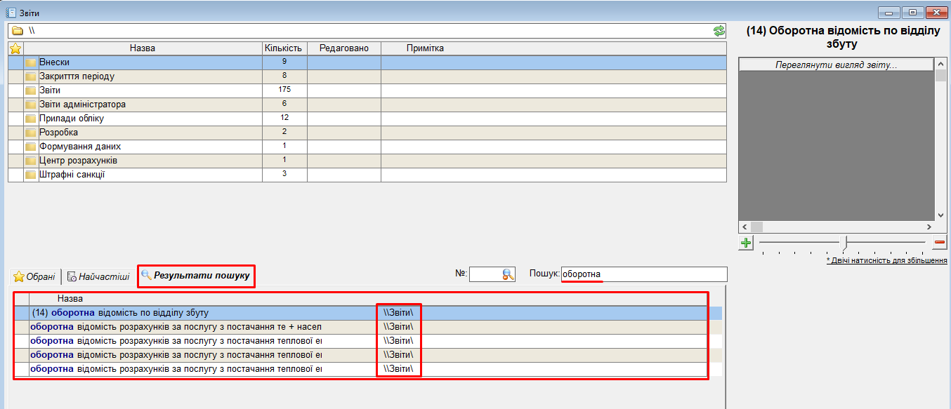і на вкладці "Результати пошуку" буде відображено заданий звіт, а також показано у які папці зі звітами він знаходиться: