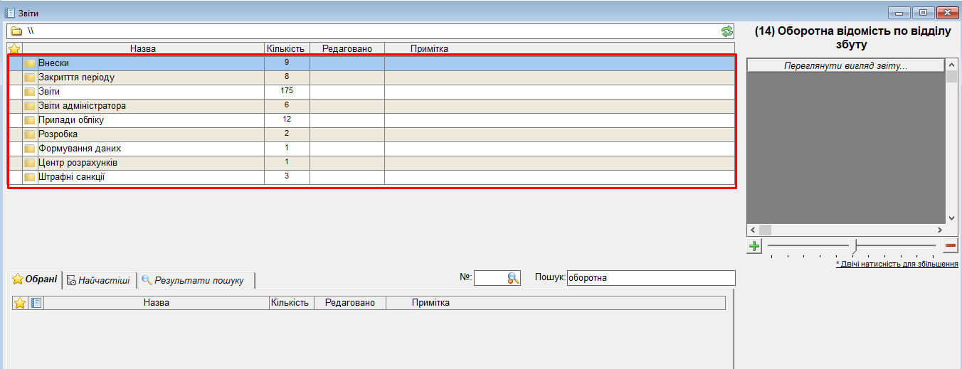 Оскільки звітів є багато, - для зручності користувач може додати найбільш часто використовувані звіти в "Обрані".