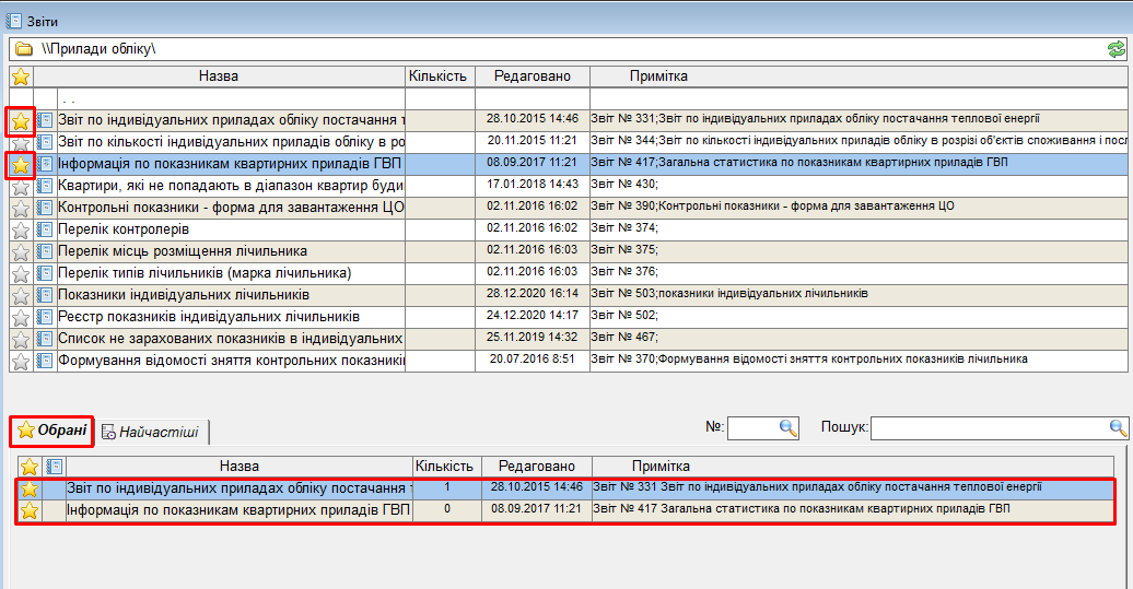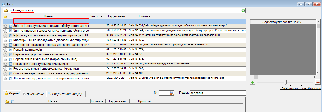Щоб додати звіт на вкладку "Обрані", - біля потрібного звіту двічі клікнути по знаку "зірочка":