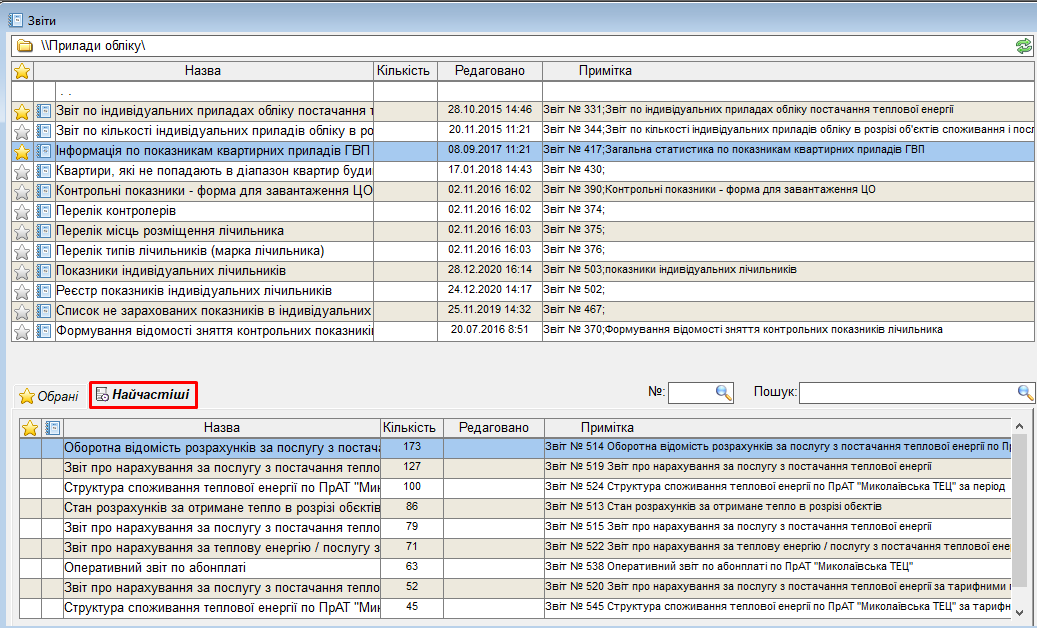 На вкладці "Найчастіші" - відображено найчастіше використовувані звіти: